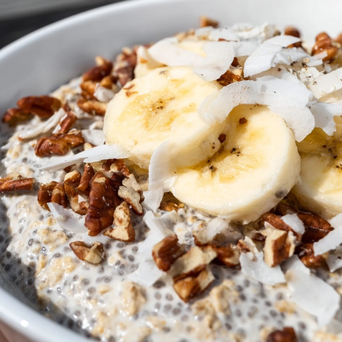 Toasted coconut flakes add crunch, while toasted pecans or almonds provide nutty flavor. Fresh banana slices complement the tropical profile beautifully.