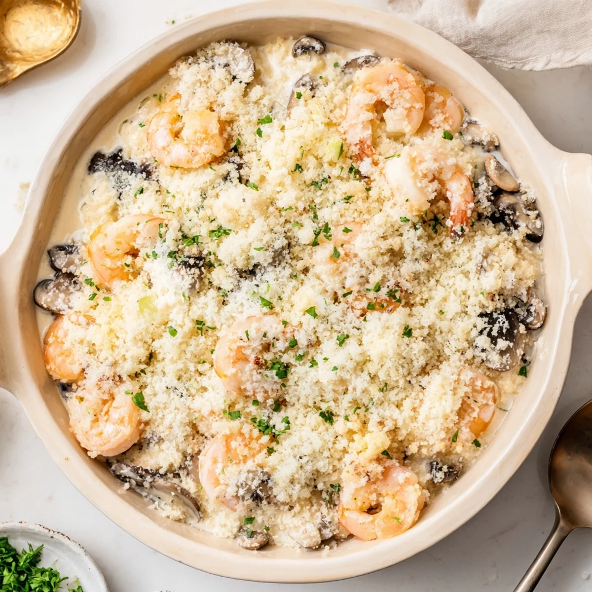 This comforting baked casserole combines plump shrimp with sliced cremini mushrooms in a velvety sour cream and milk sauce enriched with mozzarella and Parmesan. The dish comes together quickly on the stovetop before being finished under a golden panko crust. Paprika, thyme, and garlic add depth while the creamy sauce keeps everything tender and moist. Simply sauté the vegetables, create the thickened sauce, fold in the seafood and cheese, then bake until bubbly and beautifully bronzed on top.